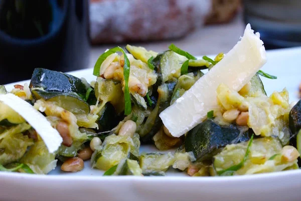 Finish the zucchini by turning the heat up to high. Cook one more minute. Add the pine nuts and stir to combine. Turn off the heat and add the basil. Remove to a platter and shave thick curls of the cheese on top.