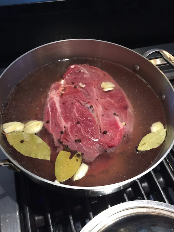 1. Remove string if there is one around meat. Please in a large pot along with garlic, bay, peppercorns and salt. Cover with water until meat is barely covered.