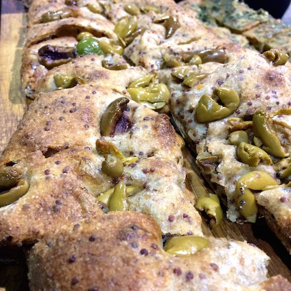 Nick got a wild hair to try something funky. We steeped a big batch of chamomile tea and used it to soak red quinoa overnight. He added that into the sprouted wheat focaccia dough before the bulk fermentation. The flavor of the chamomile didn't stand up during the bake, but the crunch and look of the quinoa was great.